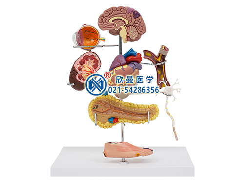 XM-407E糖尿病模型由脑、眼、心脏、肾、血管、胰腺、神经元、足8部件构成,展示了糖尿病及其并发症对人体的危害,其中心脏可以打开看到心脏内大致结构。