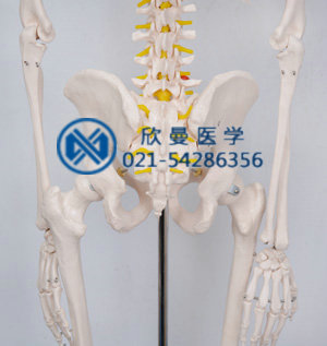 XM-101男性全身人体骨骼模型示男性成人骨骼,由男性全身散骨串制而成一整体骨架,成直立姿势,四肢大的关节部分均可活动,显示男性全身骨骼的组成和形态外观、神经分支、脊椎动脉和腰椎间盘等,头颅含可活动的下巴、可移动的头颅盖、骨缝线和三颗可取下的下牙,其中四肢骨和头颅骨可以灵活拆卸组装,整体固定在支架上,带底座,可灵活移动。